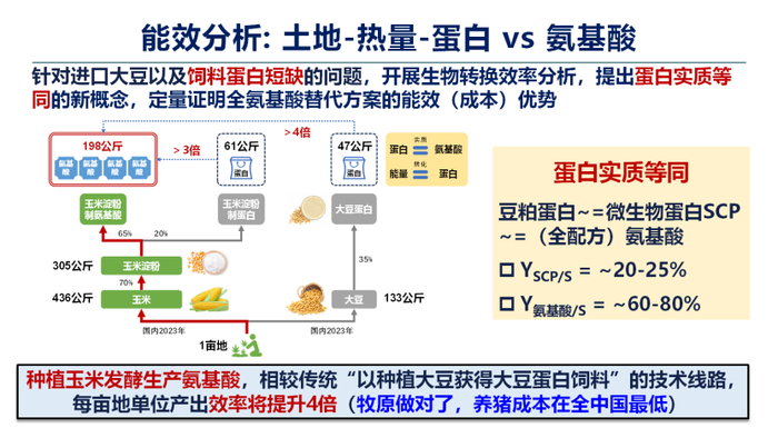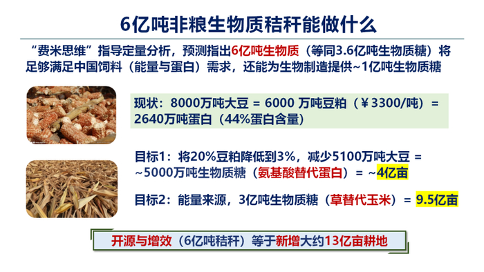 中国每年进口近亿吨大豆,其中主要用途是将榨油后的豆粕作为动物蛋白饲料。如果能用秸秆生产的淀粉和氨基酸部分替代玉米和豆粕,其战略意义不言而喻。