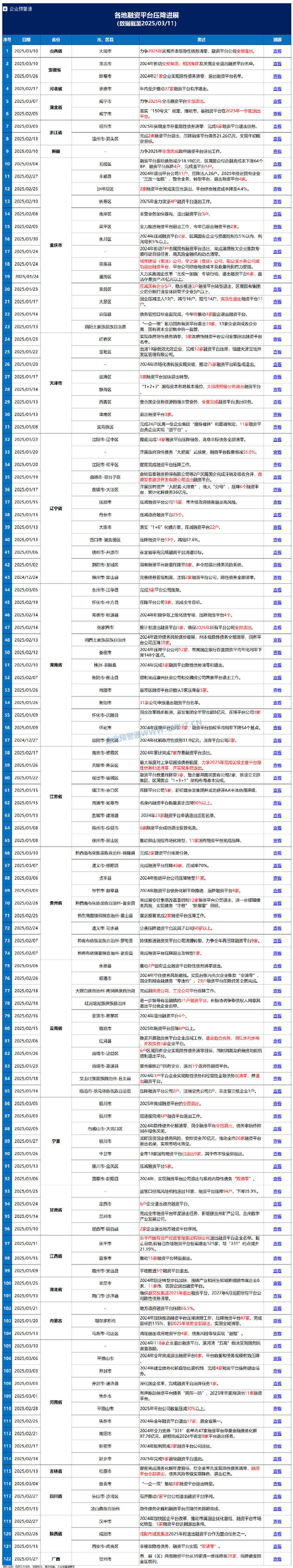 此外,不少地区表态将在2025年实现区域内融资平台全面退出。新疆、银川市、鄂尔多斯市、大同市等提及力争在2025年全面完成政府融资平台退出;咸宁市表示落实“150号文”规定,推动市、县融资平台在2025年一季度退出平台。承德市计划年内至少推动27家融资平台有序退出。