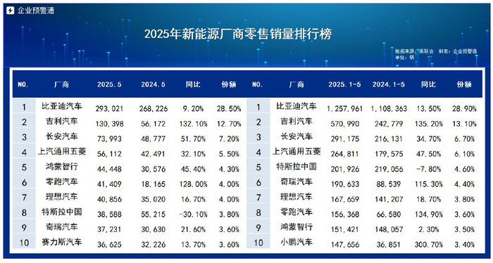 2025 年新能源汽车市场竞争愈发激烈,乘联会1-5 月零售销量数据勾勒出行业新的竞争格局。比亚迪汽车持续领跑,吉利汽车等自主品牌增速迅猛,新能源赛道的“淘汰赛”与“增长赛”同步上演。