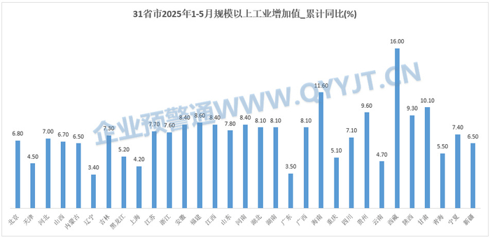分省份来看,西藏、海南、甘肃3省的表现亮眼,其规模以上工业增加值同比增速已连续2个月领跑全国,涨幅均超过10%。特别是西藏,今年已连续4个月规上增速位居全国第一,涨幅均超16%。而云南、天津、上海、广东、辽宁5省的规上增速不足5%。