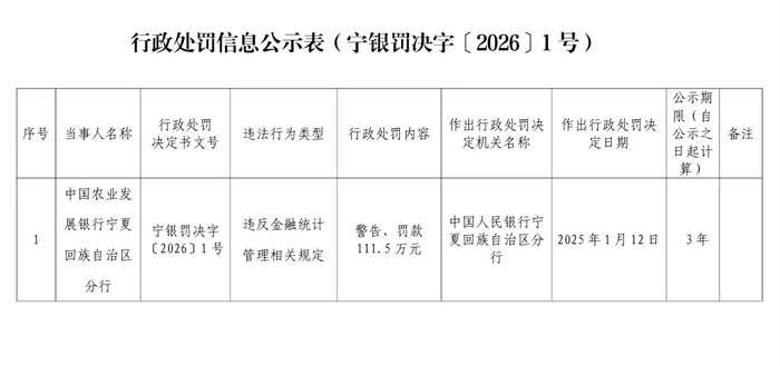财韵洞察网||2025年1月12日,中国人民银行宁夏回族自治区分行对中国农业发展银行宁夏回族自治区分行作出行政处罚(宁银罚决字〔2026〕1 号)。