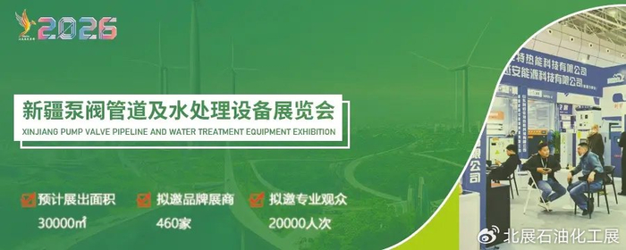 新疆泵阀管道及水处理设备展览会将于2026年4月16-18日在新疆国际会展中心隆重举办, 同期举办新疆环保技术与设备展览会。展会现场将集中展示泵 、阀门 、智能供水设备 、 排水设备 、管道/管接件 、泵管阀配套产品 、电机 、风机 、压缩机等系列产品。