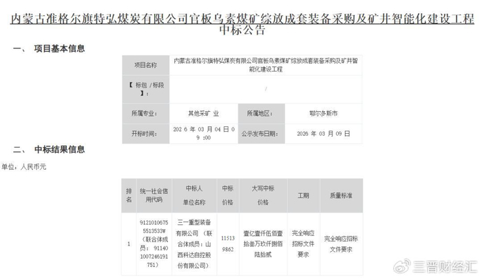 《内蒙古准格尔旗特弘煤炭有限公司官板乌素煤矿综放成套装备采购及矿井智能化建设工程中标公告》显示,科达自控携手煤机行业巨头三一重型装备有限公司(以下简称“三一重装”)成功中标该项目,中标金额达1.15亿元。