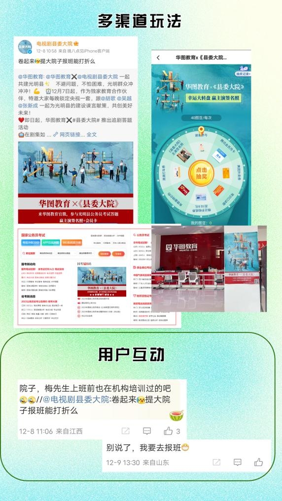 2022年二十大献礼剧《县委大院》引爆微博热度,华图教育与《县委大院》进行品牌联合,将剧情与考点相结合,带领考生以学习的角度追剧,寓教于乐,有超过2万名用户参与其中……
